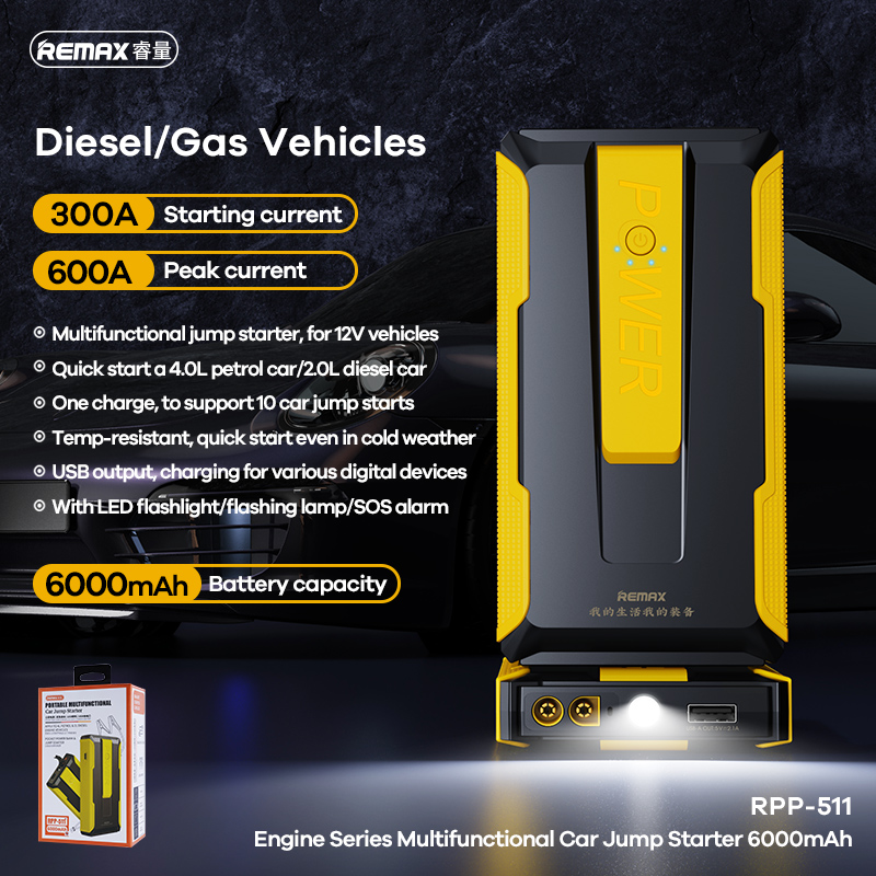 o Multifunctionaljump starter, for 12V vehicleso Quick start a 4.0L petrol car/2.0L diesel caro One charge, to support10 car jump startso Temp-resistant, quick start even in cold weathero USB output, charging for various digital deviceso WithLED flashlight/flashing lamp/SOS alarm