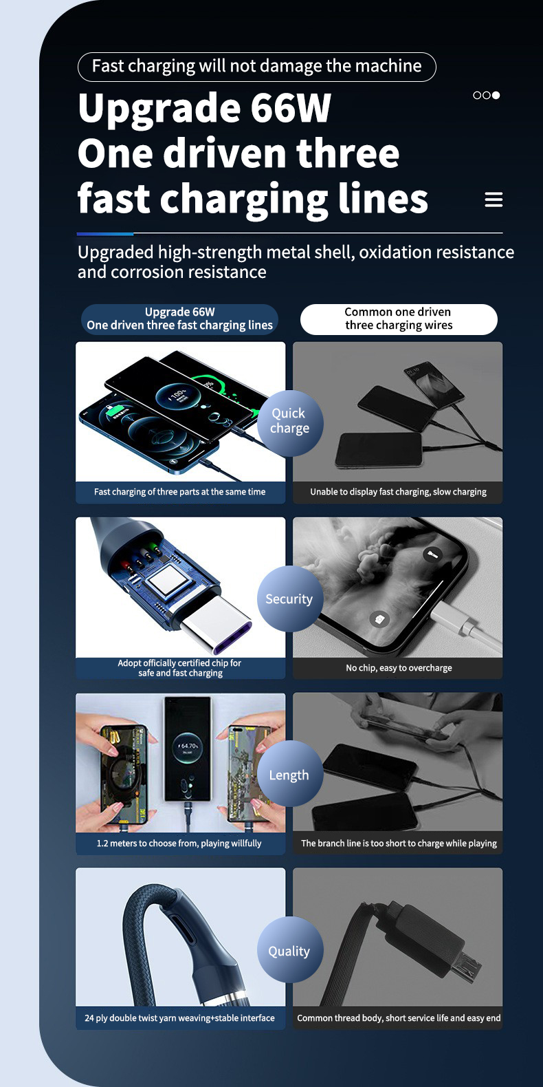 24/20AWG thick tinned copper core, plus multi-layer shielding.safe and fast charging without damaging the phone;Upgrade 66WOne driven threefast charging lines